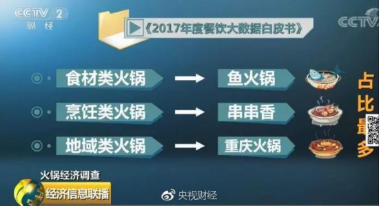 《2017年度餐饮大数据白皮书》数据还显示,在所有的火锅种类中,四川和广东的火锅网点数分布较多,食材类火锅在所有火锅类别中占比最多,为54.6%,在这一类别中:鱼火锅占比最多,烹饪类火锅中,串串香占比最多,地域类火锅中重庆火锅占比最多。