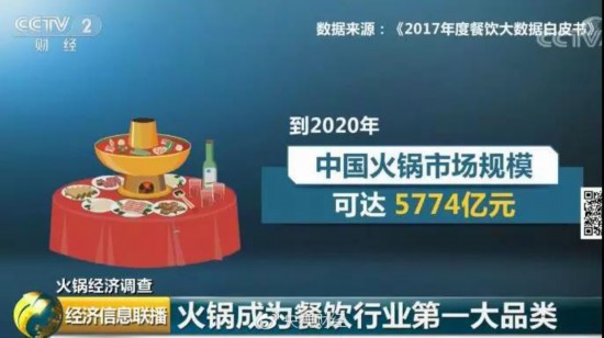 《2017年度餐饮大数据白皮书》的数据显示,截至2017年底,全国餐饮门店有578万个,其中火锅餐饮网点合计数量有29.7万家,占餐饮门店总量的5.1%。此外,近两年,火锅餐饮一直保持着两位数增长,数据公司沙利文预计,到2020年,中国火锅市场规模可达5774亿元。