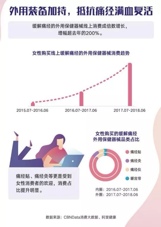 除了内服,治疗痛经的外用器械也越来越受欢迎,整体消费增速呈爆发式增长,年增幅超200%。其中,痛经贴、痛经灸等逐渐成为女性“心头好”,消费占比提升明显。