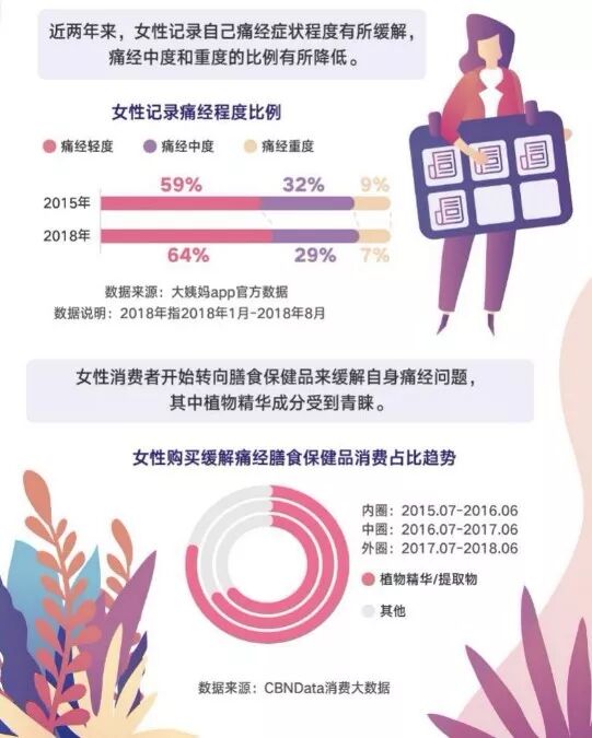 这背后,保健膳食和外用保健器械的出现,功不可没。CBNData《白皮书》指出,女性在解决痛经问题上,已经不再仅仅依赖止痛药和红糖水。一方面,含有植物精华的缓解痛经保健膳食被认可,消费占比连续三年提升,一线城市女性消费者对于这种治疗痛经的方式尤为偏爱。