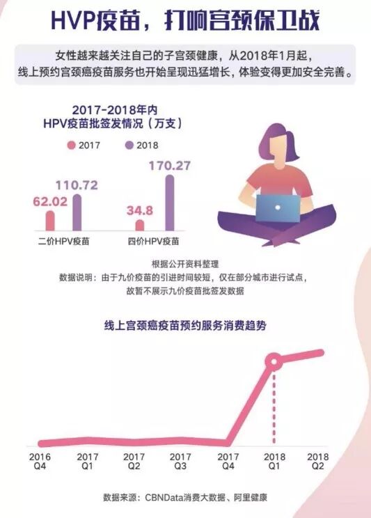 柴可指出,我国女性生殖健康依然面临严峻挑战,妇科疾病是女性生殖健康的重要威胁,应开展针对性的防治措施。同时,由于当前我国医疗费用构成不够合理,尤其是公共卫生与预防领域投入较少,进一步加重了疾病治疗负担。因此,他呼吁企业和政府考虑减免卫生用品税收,或者将其转向女性健康相关的公共卫生和预防领域。此外,随着宫颈癌防治常识普及,也推动女性开始关注自身子宫颈健康,消费者对宫颈癌疫苗的需求也更加旺盛,数据显示,2018年四价HPV疫苗批签发数量约为去年的5倍,从2018年1月起,线上预约宫颈癌疫苗服务也迅猛增长,预约体验更加安全完善。