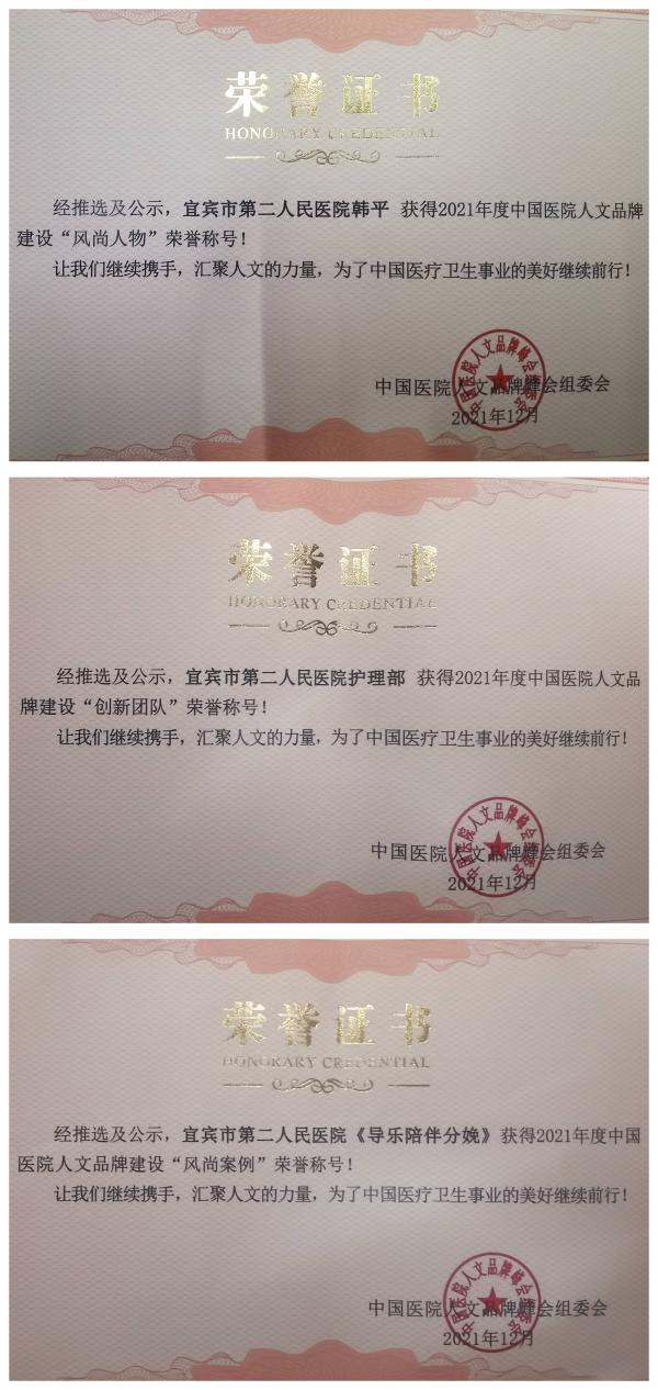 12月10日,由中国生命关怀协会、家庭与生活报、丁香园等联合举办的2021年度中国医院萤火虫计划年会暨第三届中国医院人文品牌峰会通过线上举行。宜宾市第二人民医院四川大学华西医院宜宾医院(以下简称“宜宾市二医院”)荣获“年度医联体创新发展模式奖”;护理部荣获“人文品牌建设创新团队”;产科《导乐陪伴分娩》荣获“人文品牌建设风尚案例”;党委书记韩平荣获“人文品牌建设风尚人物”。据悉,此次活动全国共有千余家医院参与,通过层层选拔,宜宾市二医院在众多医院中脱颖而出,获得殊荣。
