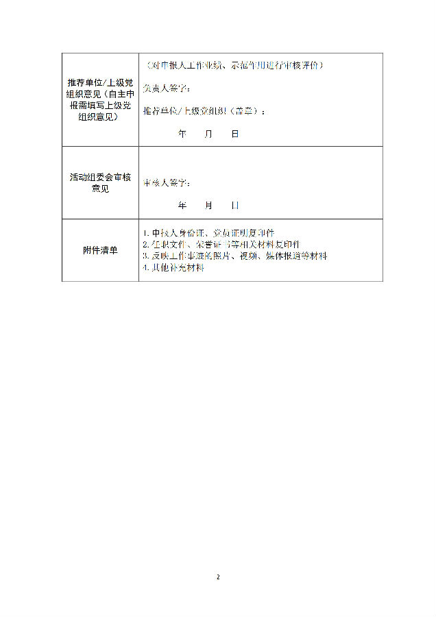推荐单位/上级党组织意见(自主申报需填写上级党组织意见) | (对申报人工作业绩、示范作用进行审核评价) 负责人签字: 推荐单位/上级党组织(盖章): 年 月 日 | |||
