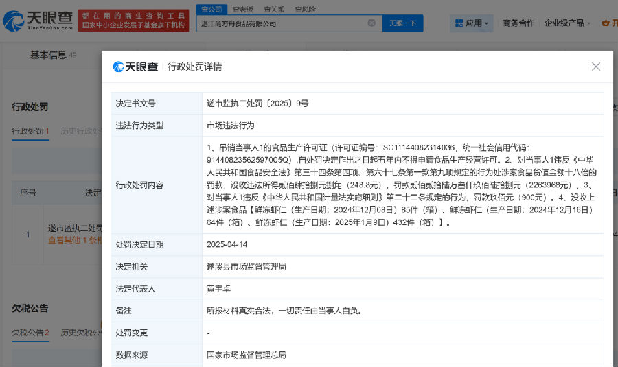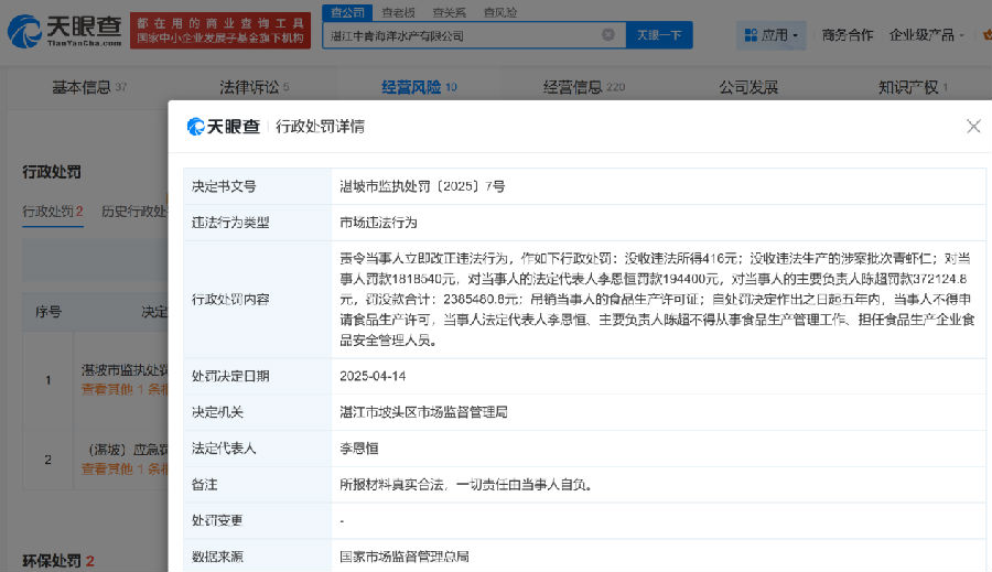 不仅如此,天眼查行政处罚信息显示,同样被3·15曝光的“泡药”虾仁涉事企业“湛江中青海洋水产有限公司”和“湛江良基冷冻食品有限公司”,都被相应市场管理局处以“没收涉事商品和违法所得、吊销食品生产许可证、百万级别罚款”等处罚。
