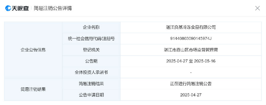 天眼查信息还显示,因食品生产许可证被吊销,且五年内不得申请,“湛江良基冷冻食品有限公司”启动了注销程序,因“化学虾仁”终结了在食品领域的经营可能。