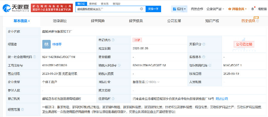 天眼查经营风险信息显示,虞城县雅恒服装加工厂已于去年3·15后被注销,被彻底清除出市场。事实上,注销并非责任终结,对于使用过该企业不合格产品后出现健康问题的消费者而言,仍可依据《公司法》及相关司法解释,起诉未依法履行清算义务的经营者,要求其承担医疗费、精神损害抚慰金等民事赔偿责任。