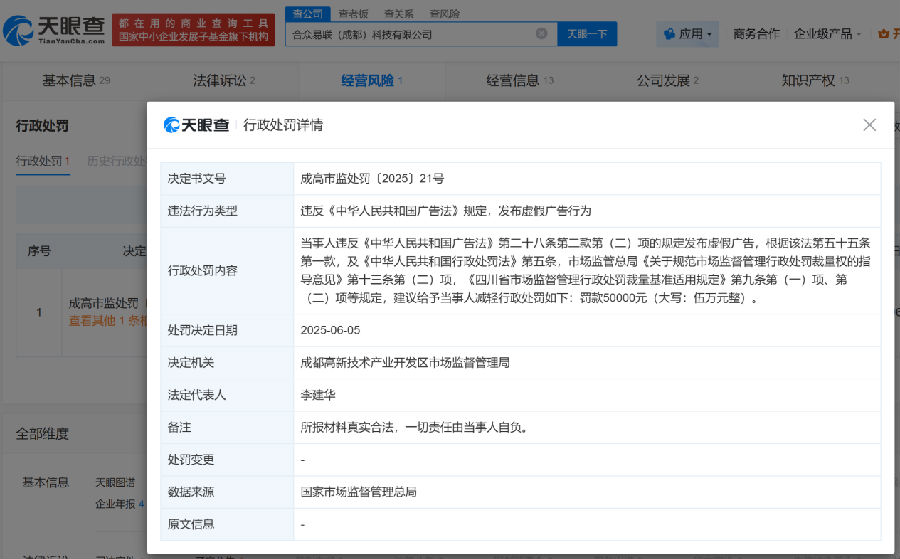而另一家“合众易联(成都)科技有限公司”则因“违反《中华人民共和国广告法》规定,发布虚假广告行为”,被成都市高新技术产业开发区市场监督管理局处以5万元罚款。