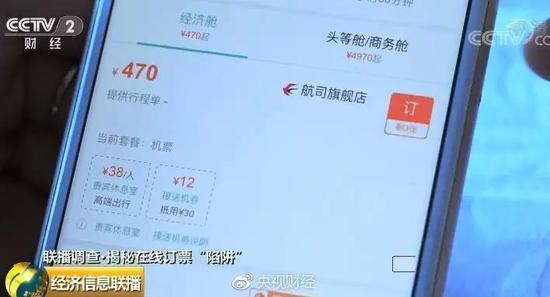 在同程旅游的手机客户端,预订了北京到青岛的航班,选择了标注着旗舰店的470元价位,在点击进入后,价格由470元变为659元。原来,同程旅游与前面三家公司一样,默认勾选了三项消费,其中一个39元的贵宾厅始终无法取消。