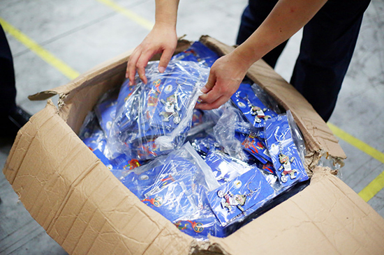 世界杯的足球具有独创的精美设计,海关查获的世界杯侵权货物大多为仿冒商标权、著作权的足球。随着海关不断加大对世界杯知识产权的保护力度,严打侵权足球后,一些不法分子将侵权目标转向了手环、钥匙扣这类小饰品上。与侵权足球相比,手环、钥匙扣虽然体积小、单价低,但是数量巨大,加上隐蔽性强、查发难度更大,所造成的侵权危害同样不容忽视。