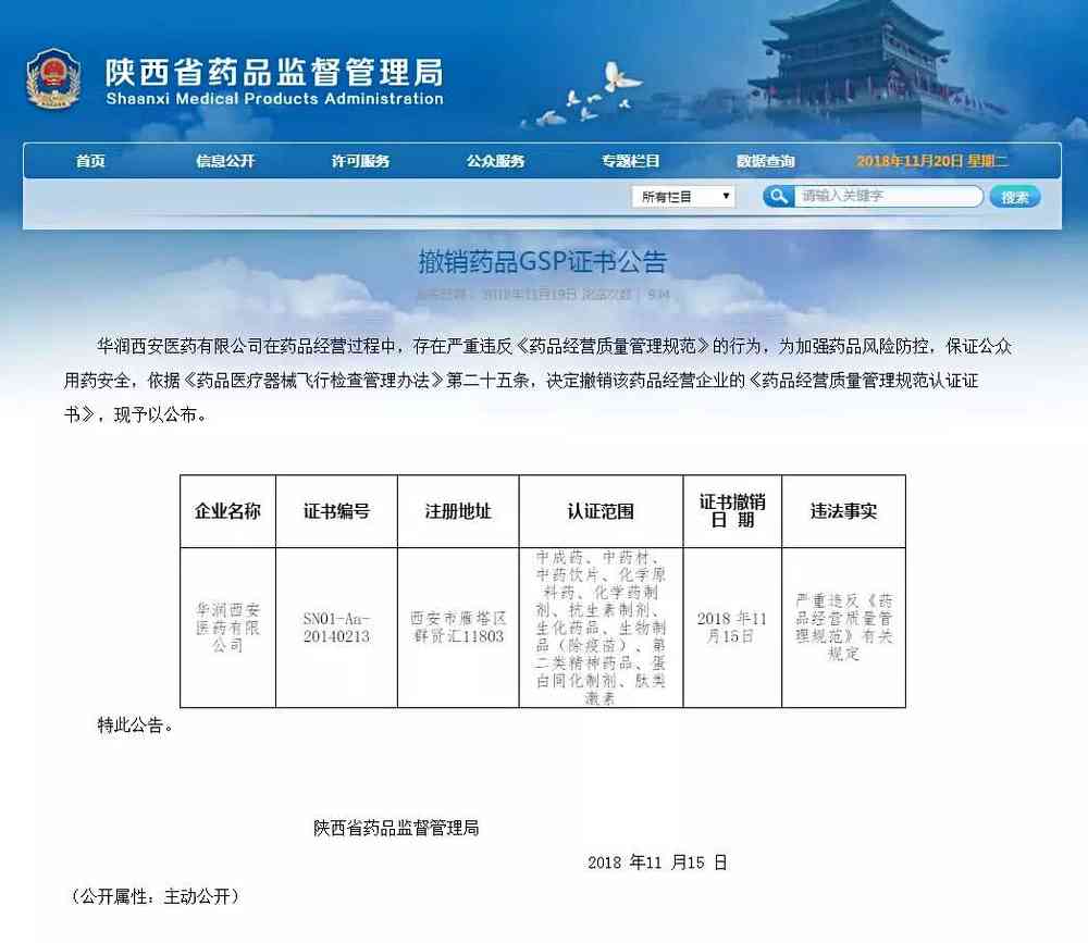 11月19日,陕西省药品监督管理局发布公告,撤销华润西安医药有限公司的药品GSP证书,这意味着,该公司被禁止在陕的经营行为。
