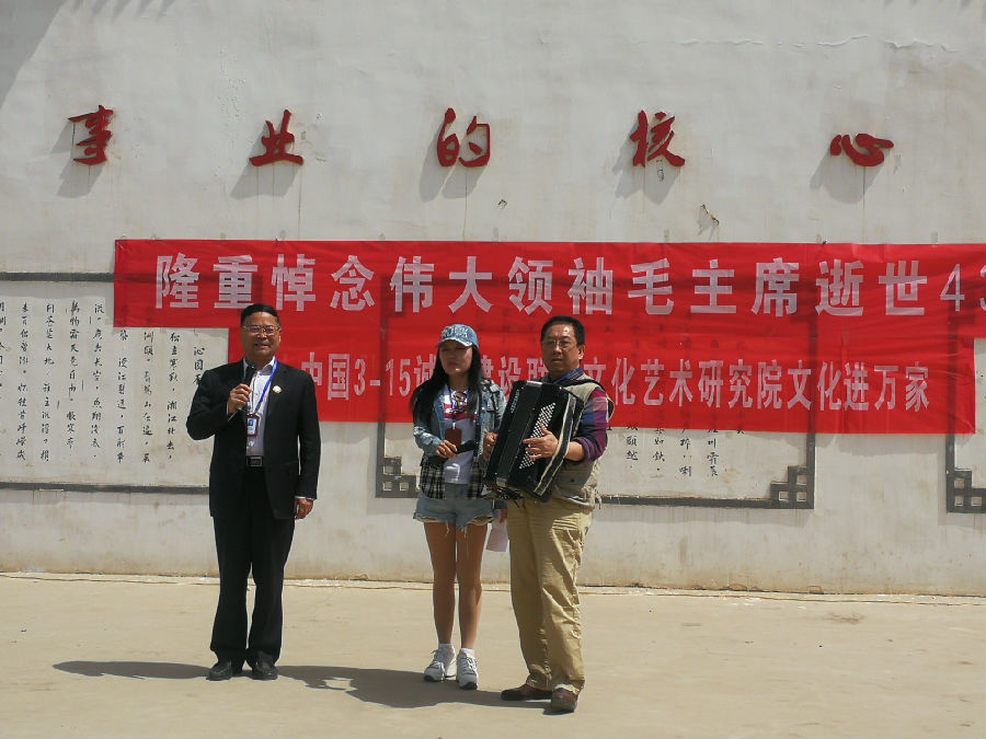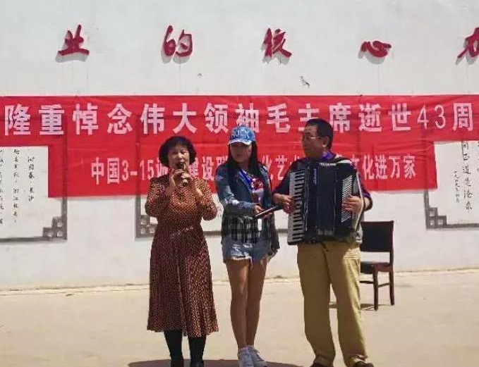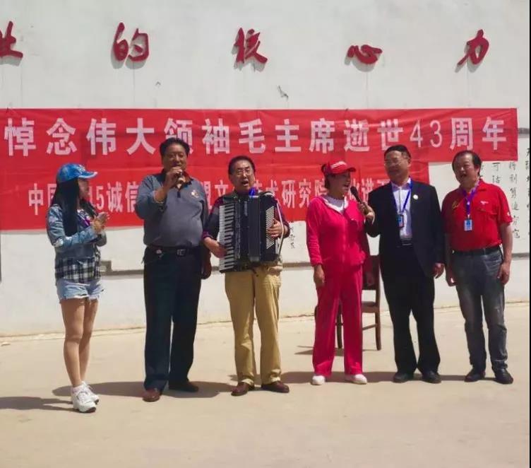 12时许,纪念毛主席文艺演出活动在村文化广场举办。中国诚信建设联盟主任吴建峰、中国诚信建设联盟文化艺术研究院院长黄俊、秘书长余宏为、中国诚信建设联盟咸阳工作站站长王永康、国家一级演员、秦腔表演艺术家刘晓玲、中国诚信建设联盟文化艺术研究院文艺部部长、著名歌手周燕西、著名女高音歌手贾玲、陕西智者教育科技有限公司总经理苗建伟等登台献艺。《祝福毛主席万寿无疆》、《在北京的金山上》、秦腔《红灯记》选段:《听奶奶讲革命》、《红星照我去战斗》、《为了谁》、《报答》、大联唱《江河颂》等红色歌曲精彩纷呈,感情投入,声情并茂,让观众们又回到了那难忘的岁月;村史馆二楼毛体书法创作基地,艺术家们挥毫泼墨,龙飞凤舞,精品频现。