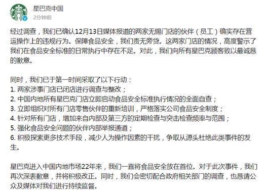 经过调查,我们已确认12月13日媒体报道的两家无锡门店的伙伴(员工)确实存在营运操作上的违规行为。保障食品安全,我们责无旁贷。这两家门店的情况,高度警示了我们在食品安全标准的日常执行中存在不足。对此,我们向所有星巴克顾客致以最诚恳的歉意。