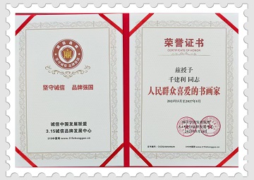 5月18日,诚信中国发展联盟、3.15诚信品牌发展中心授予千建利同志“人民群众喜爱的书画家”荣誉。