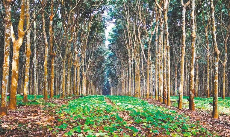 在距离西双版纳傣族自治州景洪市环城北路约1公里处,记者见到云南省热带作物科学研究所占地1054亩的环境友好型生态胶园千亩试验示范基地。这里将橡胶树种植行距从传统8米扩大到20米以上,在橡胶树间套种上述经济作物。如此布局,即使橡胶行情不好,经过精心筛选套种的其他经济作物也能取得不错的经济效益。