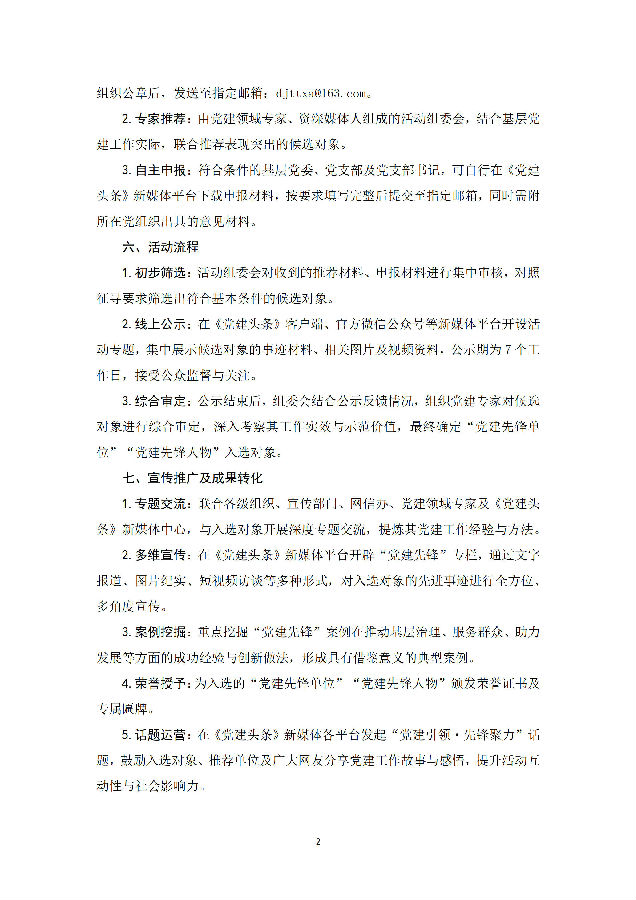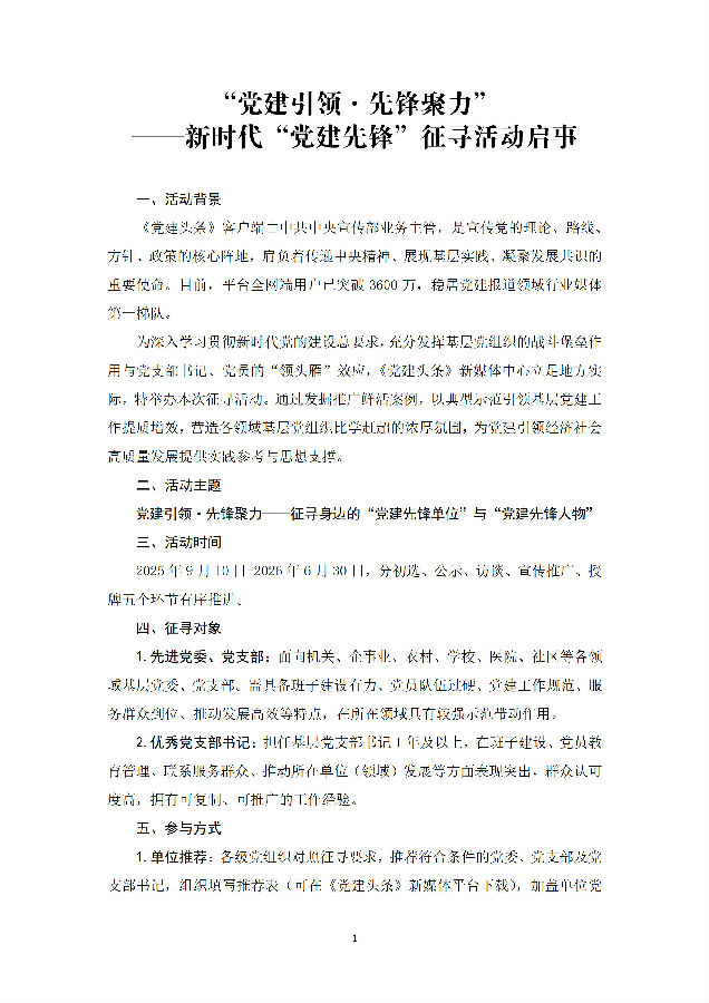 5.话题运营:在《党建头条》新媒体各平台发起“党建引领?先锋聚力”话题,鼓励入选对象、推荐单位及广大网友分享党建工作故事与感悟,提升活动互动性与社会影响力。