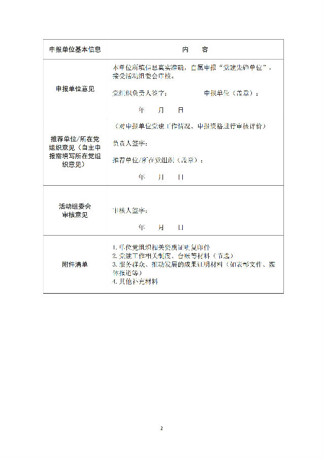 附件清单 | 1.单位党组织相关资质证明复印件 2.党建工作相关制度、台账等材料(节选) 3.服务群众、推动发展的成果证明材料(如表彰文件、媒体报道等) 4.其他补充材料 |